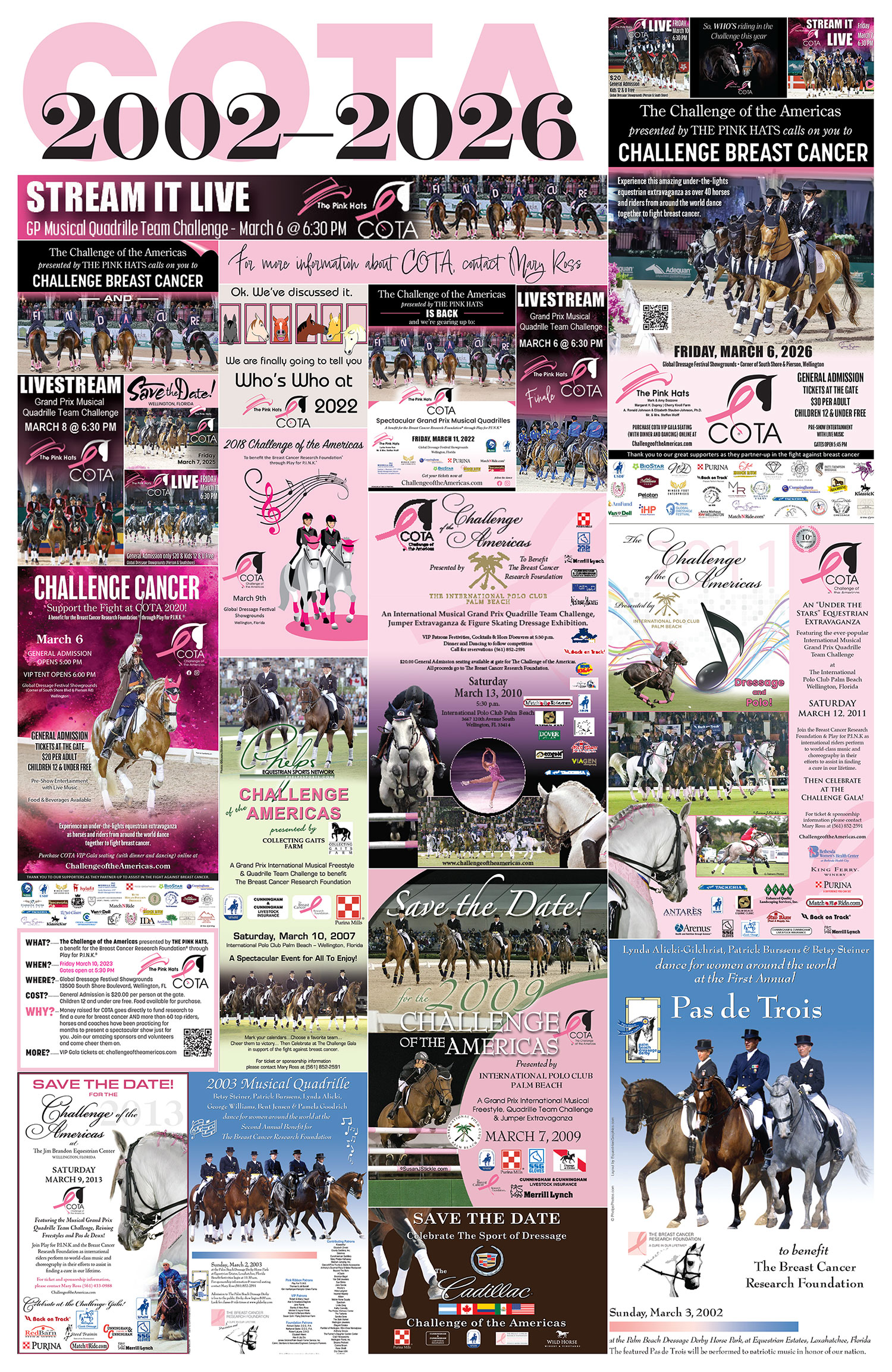 As Mary herself reflected, “We couldn’t have grown the Challenge into a premier event of the Wellington winter season without the help of our generous sponsors, the talented riders and their horses who donated their time and expertise, the coaches, choreographers and music makers who turned competitive dressage into something audiences could feel, the COTA Committee members, and the countless volunteers who donated their time in support of COTA’s mission. Our goal was to challenge breast cancer and, with their help, we made a significant donation to the Breast Cancer Research Foundation through Play for P.I.N.K.”